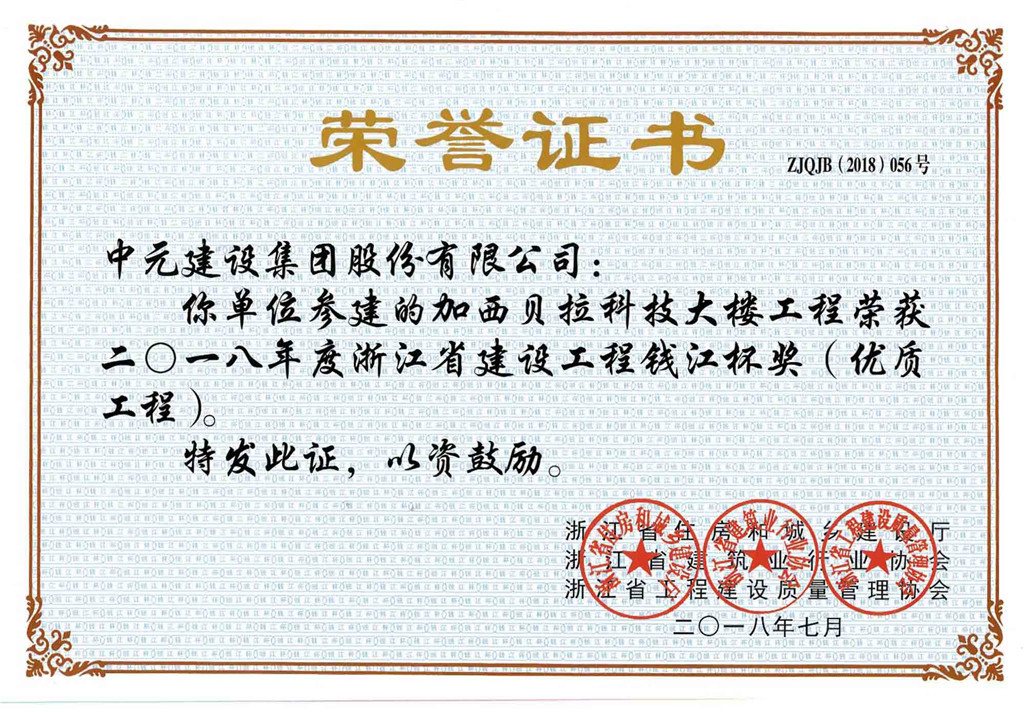 2018年度浙江省建设工程钱江杯奖(优质工程)-加西贝拉科技大楼工程