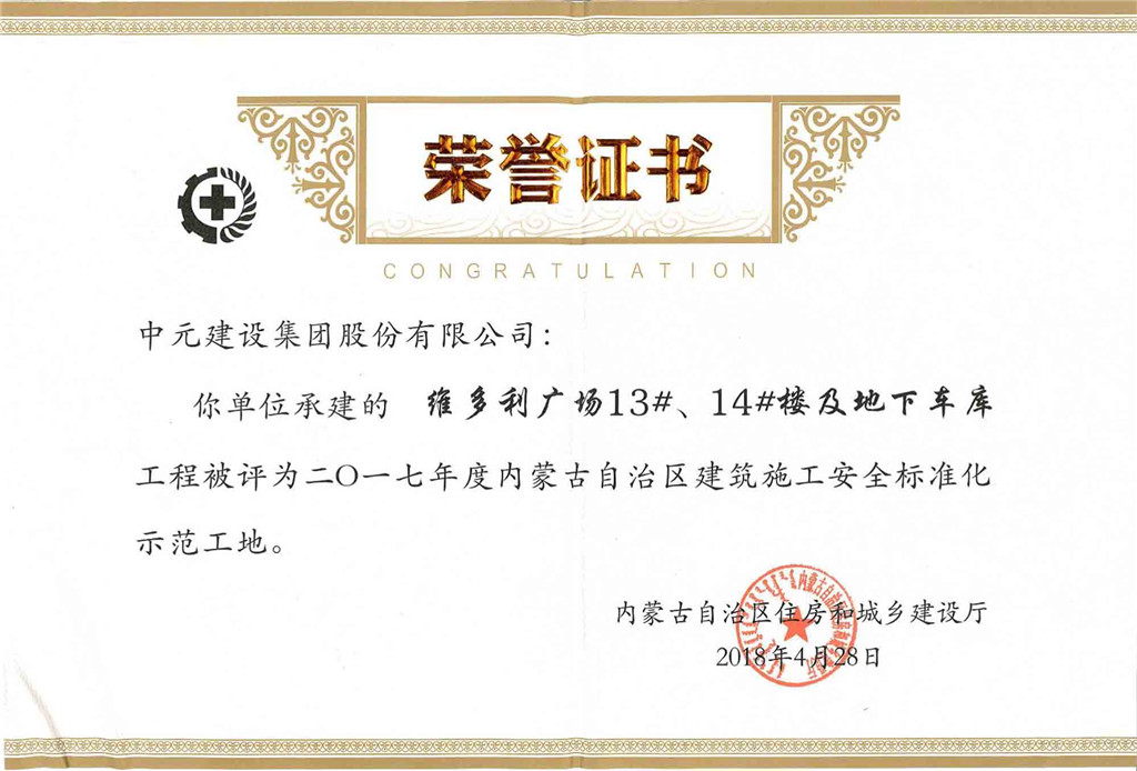 2017年度内蒙古自治区建筑施工安全标准化示范工地(维多利广场13号、14号楼及地下车库工程)
