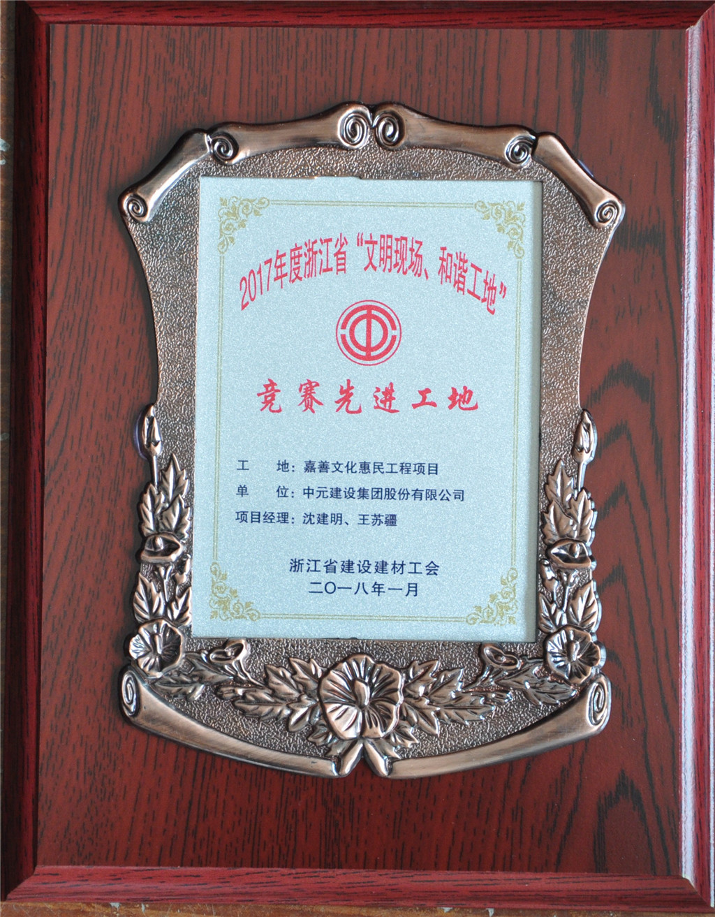2017年竞赛先进工地(工地:嘉善文化惠民工程项目 项目经理:沈建明、王苏疆)