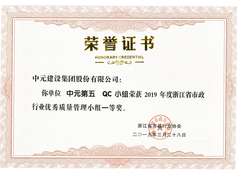 2019年度浙江省市政行业优秀质量管理小组一等奖(sunbet申搏第五QC小组)