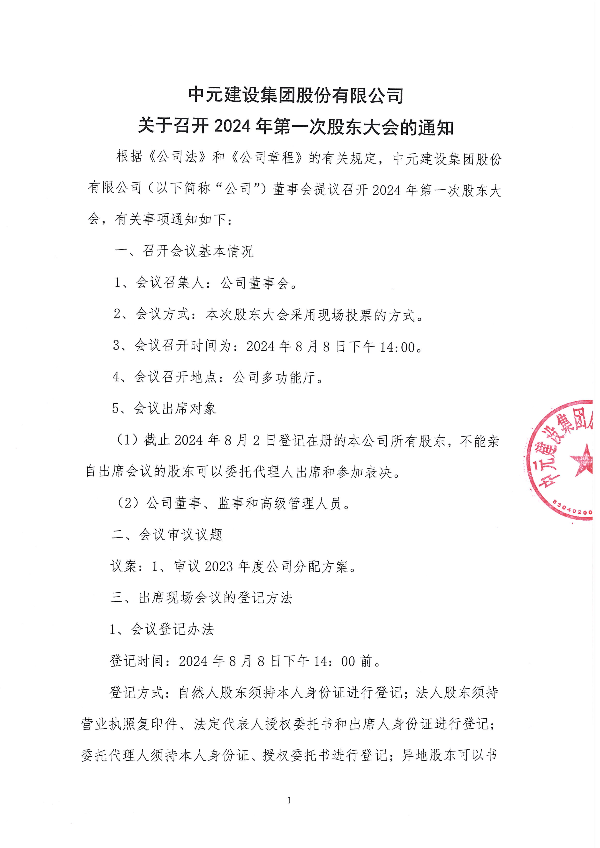 关于召开 2024 年第一次股东大会的通知
